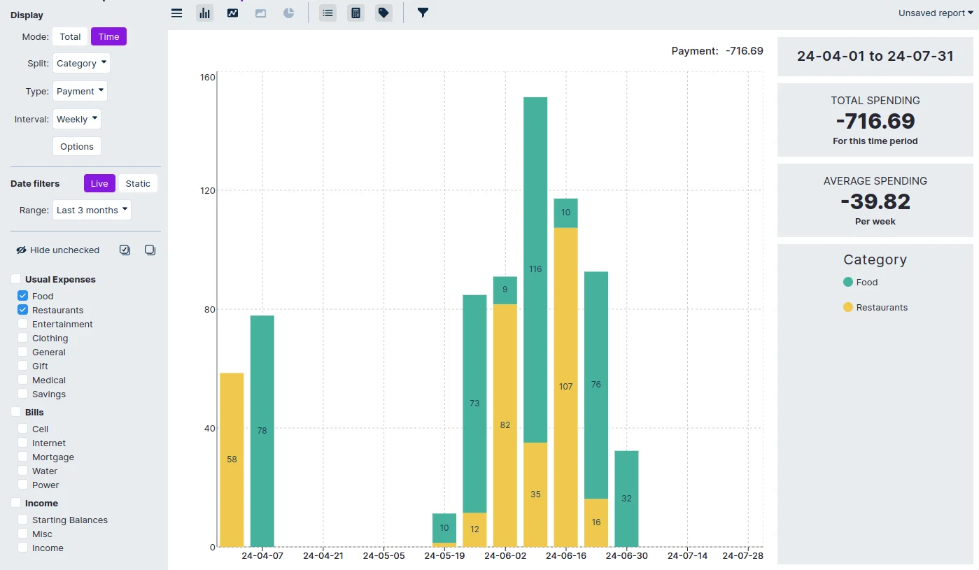 Here is an example of the kind of granularity you can achieve with these custom reports. This report is viewing how much was spent on food, by week, in both the Food and Restaurant categories over the last few months.