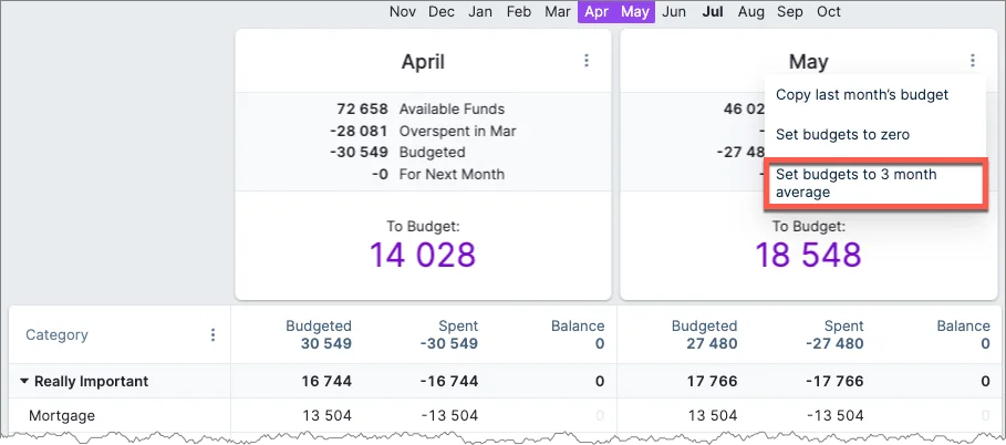 You have two easy ways to populate the various budget values when this is done. You can apply the last three months' average on all budget categories: