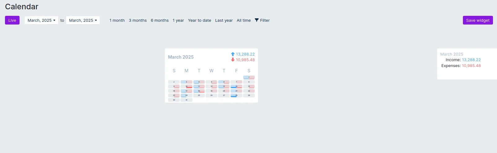 The calendar card displays daily income and expenses in a calendar format for a specified time period.